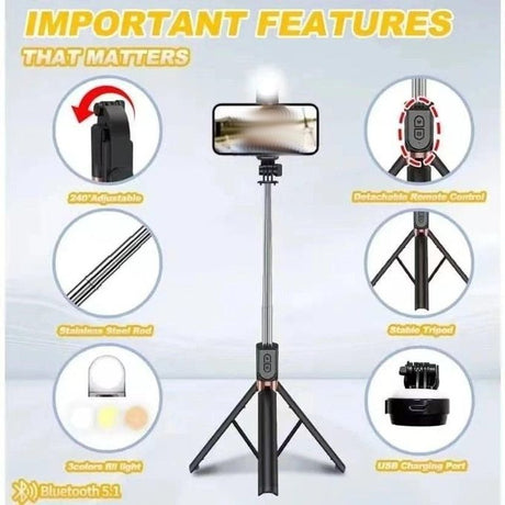 Prix soldé 49.00 Dhs Prix habituel 100.00 DhsPrix unitaire /غير متوفره Trépied Selfie 3-en-1 avec Lumière LED & Télécommande