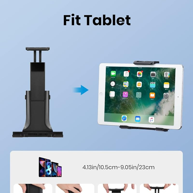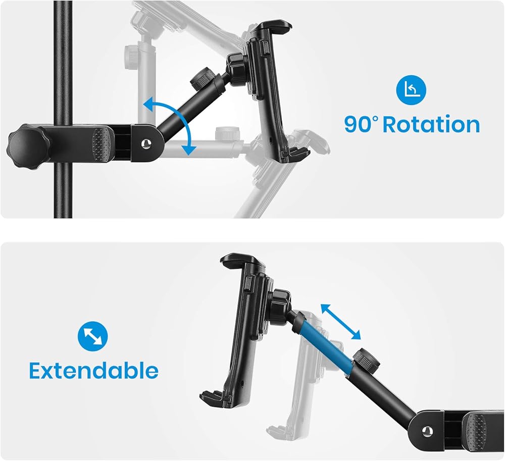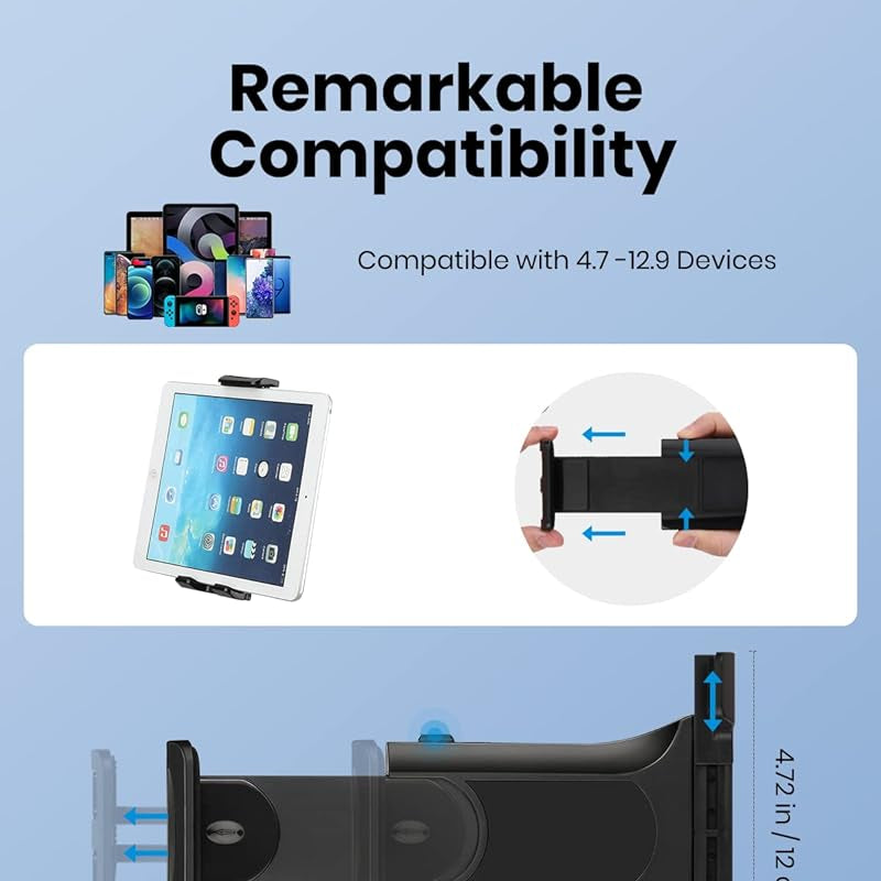 Son système extensible s’adapte aux appareils de 4,7 à 12,9 pouces, ce qui le rend compatible avec la majorité des smartphones et tablettes du marché. La pince robuste avec revêtement en caoutchouc antidérapant garantit une fixation stable sans rayer l’appareil.