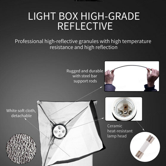 🔹 Boîte à lumière 50x70 cm : tissu diffuseur blanc pour une lumière douce et homogène, intérieur argenté pour une réflexion maximale.
