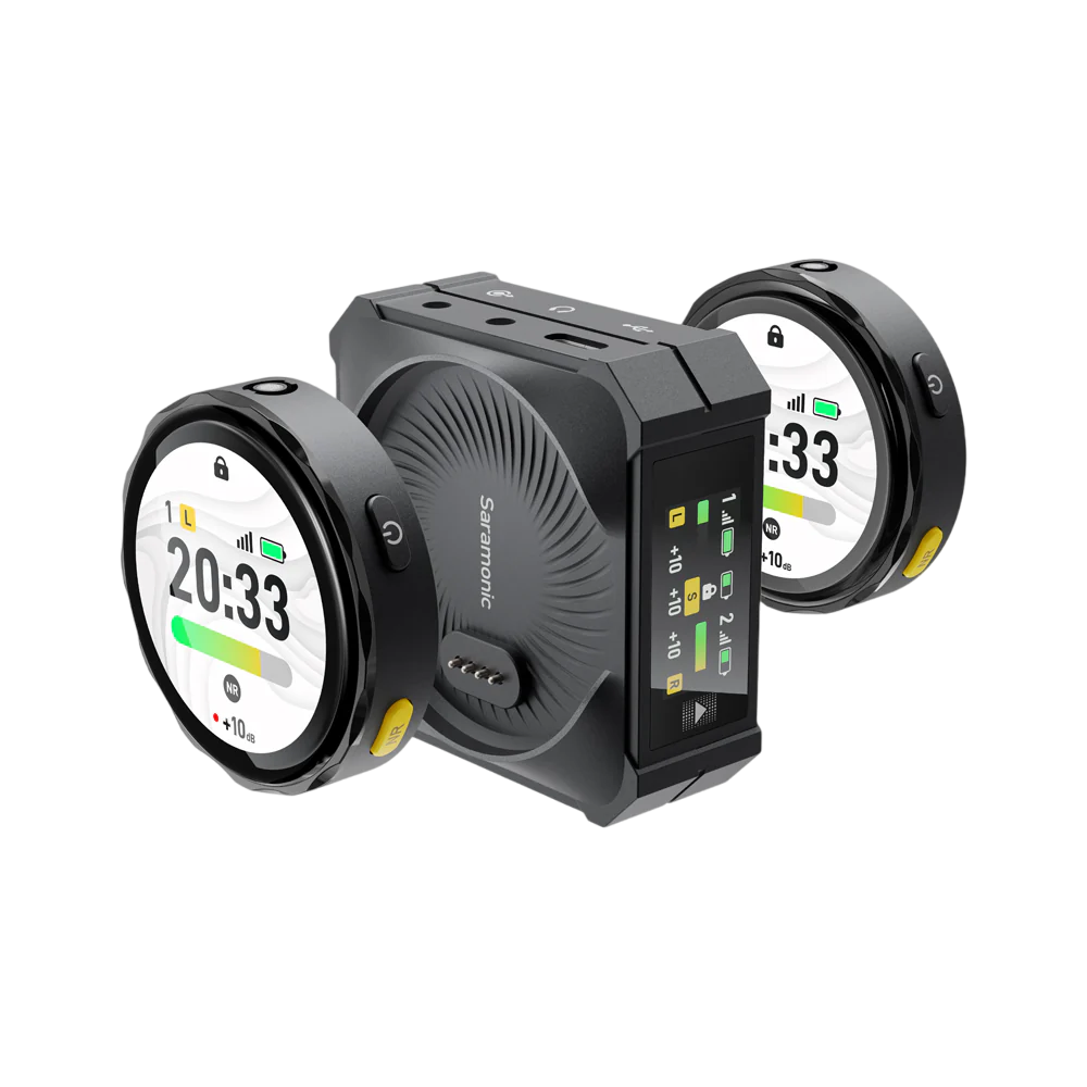 Le récepteur à double écran tactile bénéficie d'une autonomie de 24 heures, avec des réglages de sortie Mono/Stéréo/Safety, une sortie casque, un écran OLED avec affichage des niveaux, une sortie audio numérique USB-C et un câble multi-appareils 3.5mm.