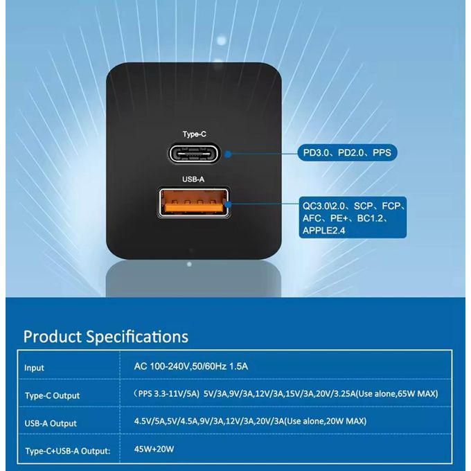 • Avantages principaux : charge rapide 65W, format compact, haute sécurité, large compatibilité, technologie GaN moderne