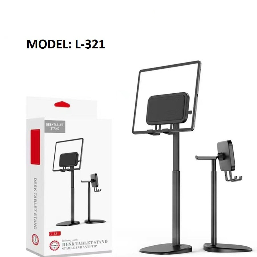 The L-321 desktop stand is a sturdy, height-adjustable support designed for tablets and smartphones. Built with a heavy anti-slip base, it stays perfectly stable on desks, counters, and workstations.