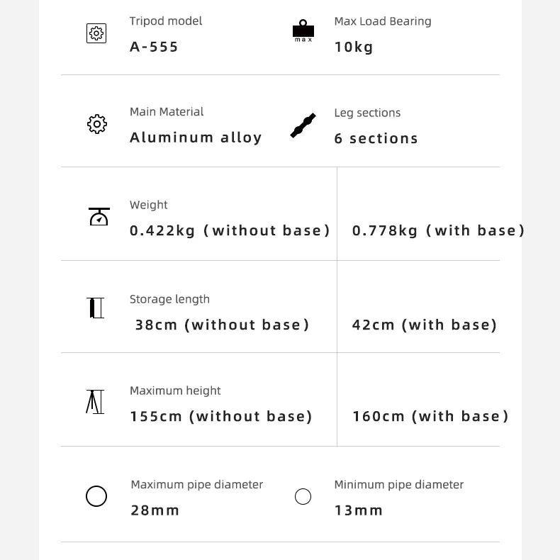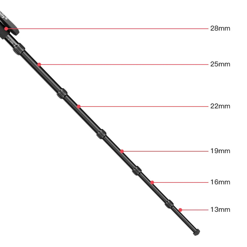 Sa structure à 6 sections avec système de verrouillage rotatif quart de tour permet un réglage rapide et sécurisé de la hauteur jusqu’à 155 cm. Le diamètre maximal de 28 mm assure une stabilité optimale, même avec des équipements lourds.