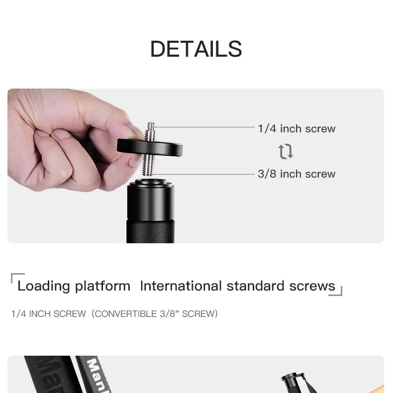 Compatible avec les filetages standards 1/4" et 3/8", il s’adapte à la majorité des appareils photo reflex, hybrides, caméras et rotules professionnelles. La poignée ergonomique avec dragonne améliore la prise en main et la sécurité lors des prises de vue.