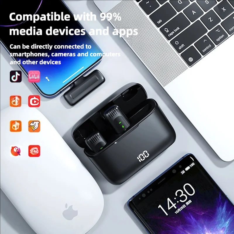 Grâce à la connexion 2.4GHz, la transmission est stable et claire jusqu’à 40 mètres. Les micros offrent une réduction intelligente du bruit et une qualité audio professionnelle sans application requise — plug & play sur iPhone (Lightning) ou Android/PC (Type-C).
