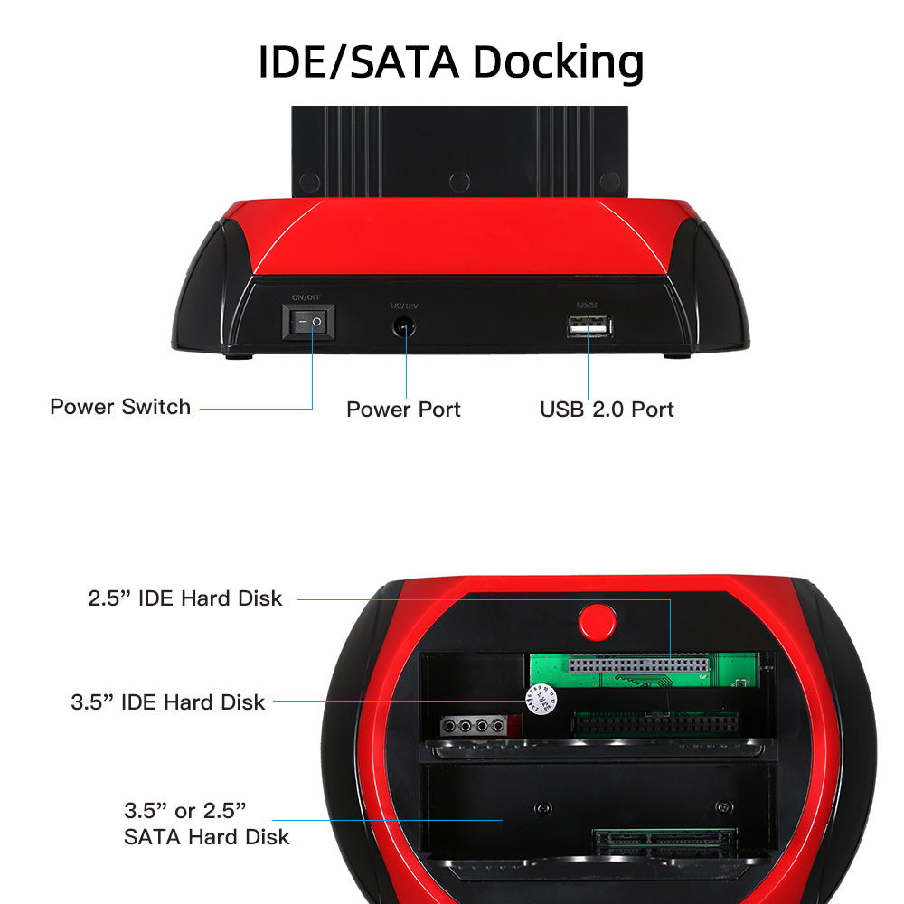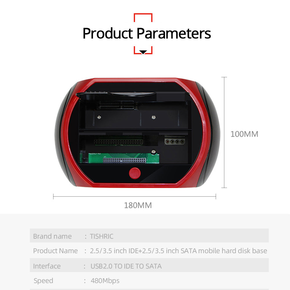 Nom de marque: TISHRIC Nom du produit: 2.5 / 3.5 pouces IDE + 2. 5 / 3. 5 Base de disque dur mobile SATA Interface: USB2. 0 À IDE À SATA Vitesse: 480Mbps Couleur: rouge et noir Entrée: 100-240V 50-60Hz 0.5A Sortie: 12V-2A , 5.0V-3 5A Matériau: Plastique